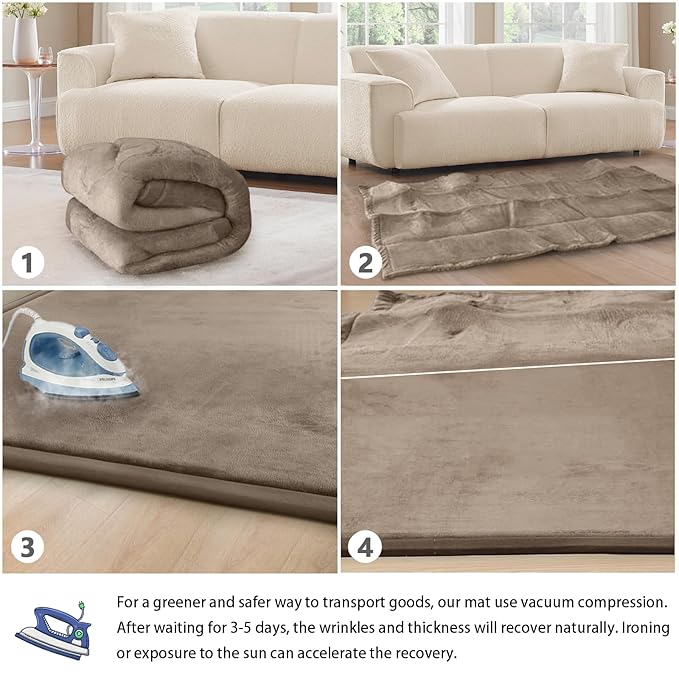 - đHOW TO CARE FOR YOUR MAT:When you open the package,it may be wrinkled,very flat and inelastic.Don't fret - this is normal! As long as it is left for 3-5 days, the mat will naturally regain its thickness and elasticity. we recommend steaming or ironing it to speed up recovery. After you have completed the steaming/ironing, your thick floor padded mat should rebound and be ready to use!