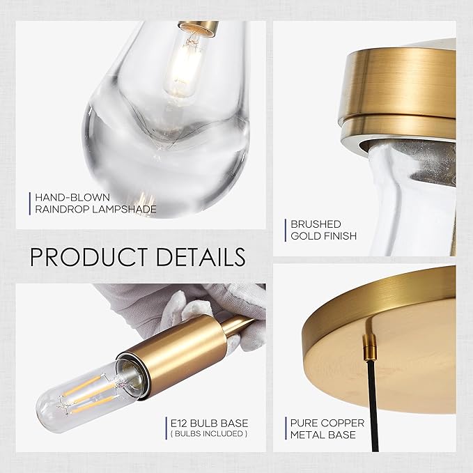 - 【Compatible with Various Bulbs】Glass Pendant Light features compatibility with dimmer, and 3 E12 bulbs base (Bulbs Included). Kitchen Lighting Fixtures will create an enchanting light that illuminates your space with a cosy and warm atmosphere.This is perfect for kitchen islands, living rooms, hallways, foyers, bars, or cafes.