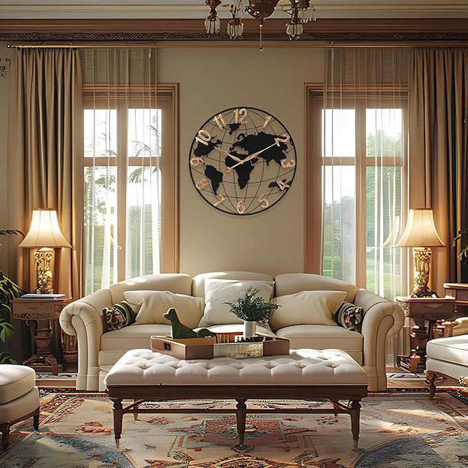 - 【Focal Point of Living Room】 Pytha Sight 30 inch world maps wall clock is a stunning piece,sure to captivate your guests:It fits perfectly above fireplaces,and the vintage gold arabic numerals with classical vintage pointers help you read the numbers more:Our beautiful large wall clocks complements your living room decor,adding an elegant touch to your home;With its impressive large wall clock 30 inches or larger,this giant oversized wall clock is a perfect size for any room, and it has become a conversation starter whenever guests visit.