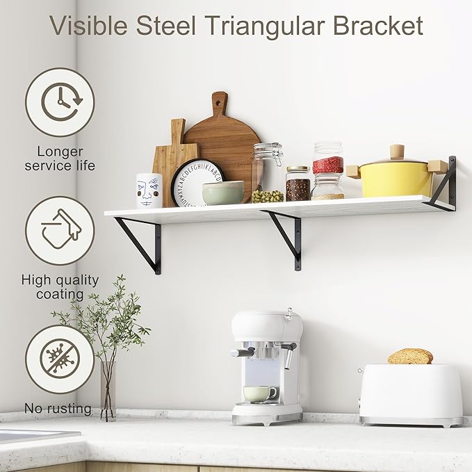 - 【FARMHOUSE RUSTIC WALL SHELF】These floating shelves are made of premium engineered wood board and visible triangular bracket. The rustic wooden grain surface add character and warmth to any modern or traditional interior with these deep floating shelves, contrast shelves at staggering heights on the wall or mount side-by-side or in the corner for a clean streamlined look.