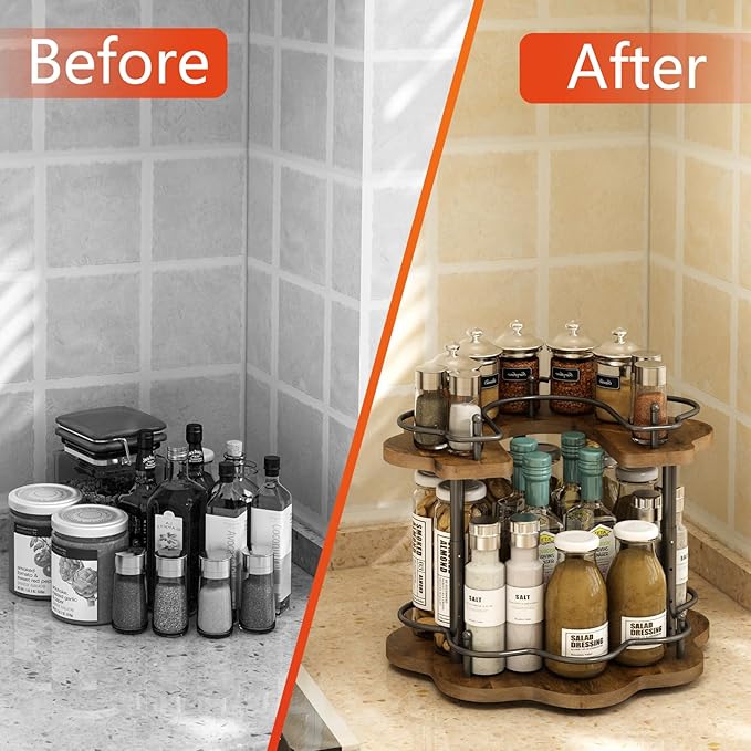- 【Quality Materials】This 2-Tier Lazy Susan Organizer is made of vintage solid wood and metal and is very sturdy and durable. Unlike ordinary wood, it has a special coating that makes it waterproof and heat-resistant, so it can be used in a variety of scenarios and is much easier to clean.