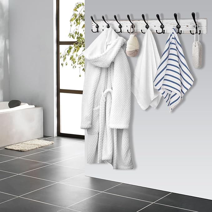 32.2'' Large Coat Rack Wall Mount Coat Hooks with 8 Metal Black Triple-Hooks Old White Pine Real Wood Plank Hat Rack for Wall Hooks
