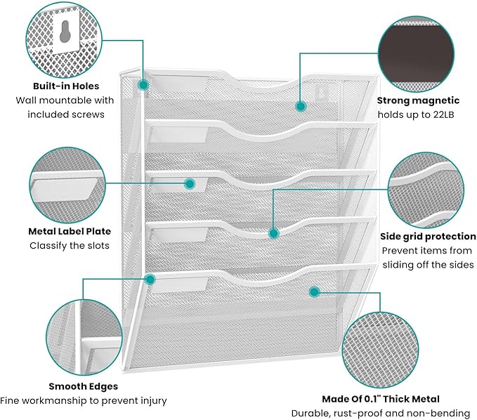 - 5 Tier Magnetic Wall File Organizer: This 5-tier vertical pocket wall-mounted file organizer is perfect for classifying and storing documents, recipes, mail, coupons, and more. It can also be used as a refrigerator file organizer to keep your mail in check.