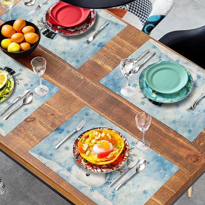 - TABLE DECORATION: The blue snowman dinner placemats adopts high-definition printing technology, with clear patterns and bright colors; The blue table placemats is printed with beautiful snowman and snowflake patterns; The unique and eye-catching seasonal patterns add charm to the Christmas table mats, creating a strong winter atmosphere for your party.