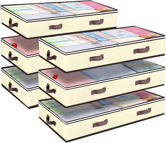 Budding Joy 6 Pack 90L Under bed Storage Containers Organizer Large Capacity Underbed Clothes Storage Bins Organization and Storage Bedroom Foldable Storage Bags with Clear Window Beige
