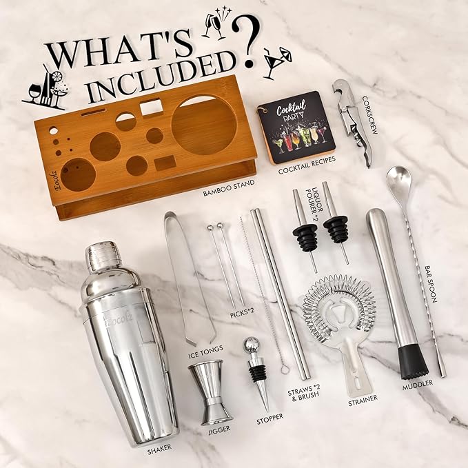 - Make Drinks Professional Tool Set: This 17-piece cocktail shaker set contains most essential bartending tools needed for start mixing drinks, 25 oz martini shaker, double jigger, bar spoon, muddler, strainer, ice tongs, liquor pourers, corkscrew, straws with brush, stopper, picks, Recipes and stand