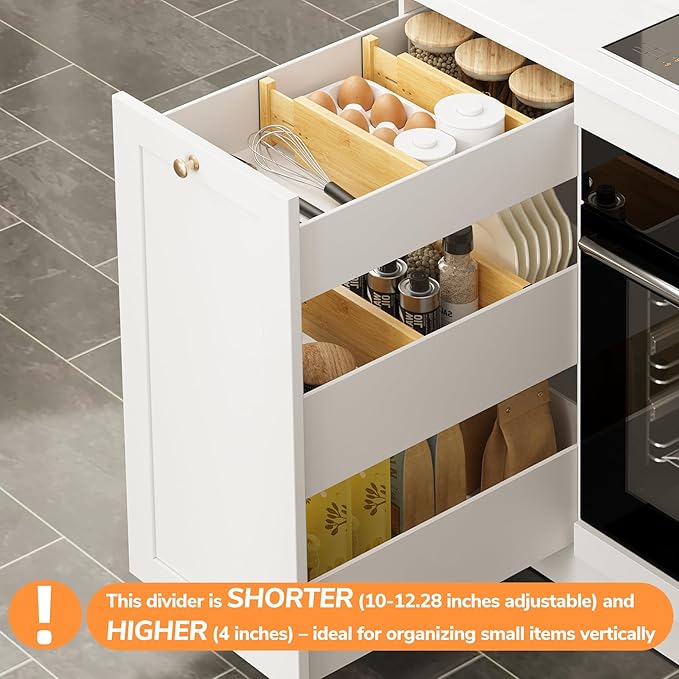 - Expandable design: Each deep drawer divider is 4" H, 0.6"W, and 10" to 12.28"L, which can be adjusted according to the size of the drawer, adapting to different furniture needs. Fits at least 4"H & 10-11.5"W drawers. Do not overstretch—may reduce elasticity if extended beyond recommended length.