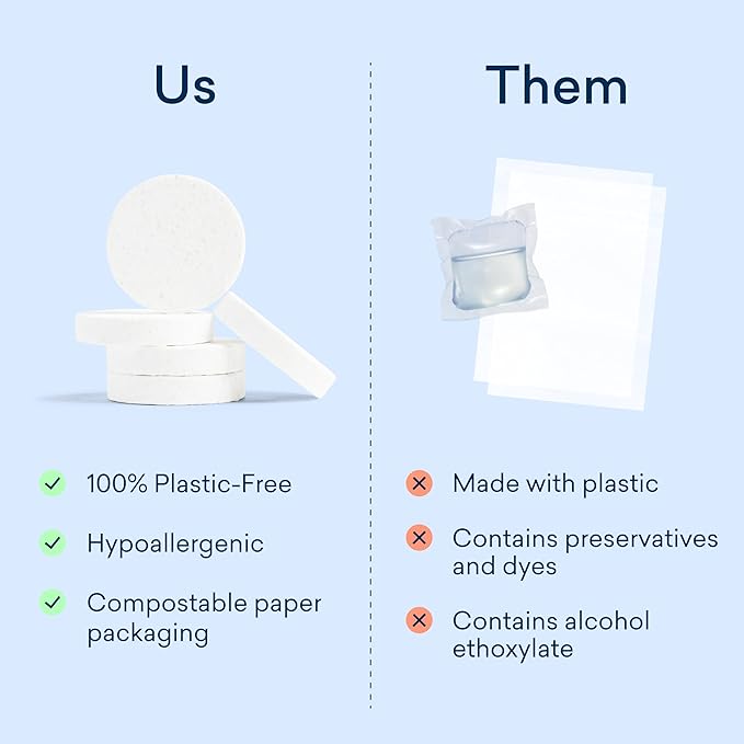 - PLASTIC-FREE, ECO-FRIENDLY LAUNDRY TABLETS. Tough on stains, gentle on the planet. Our 100% plastic-free tablet is tried, tested, and proven to lift the toughest stains—from grass and coffee to food and makeup—without any harsh chemicals. Formulated safe for family, healthier for planet, and powerfully effective so you can ditch plastic pods and sheets for a higher standard of clean.