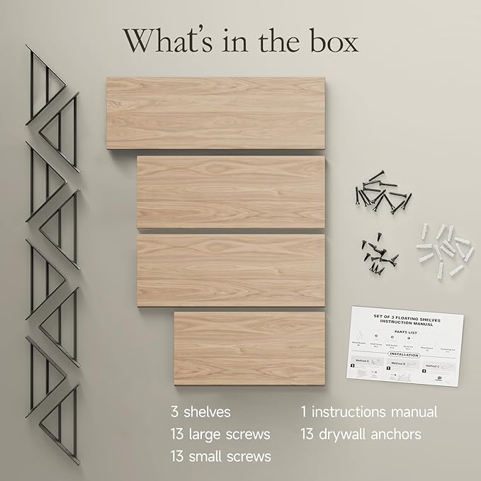 - **Three different size Floating Shelves for All** : Large: 16.5 Ă— 5.5 Ă— 4.6 inches; Medium: 14.2 Ă— 5.5 Ă— 4.6 inches; Small: 11.4 Ă— 5.5 Ă— 4.6 inches. These floating shelves are wider and sturdier than others to safely hold collectibles, photos, small plants and showcase favorite dishes or build your own coffee bar. Easy to assemble with all necessary hardware included according to the instruction steps.