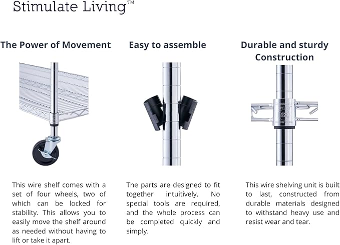 - â EASY ASSEMBLYâ Our Stimulate Living Wire Shelving is designed with simplicity in mind, making assembly quick and hassle-free. You can easily set it up in no time and start using it immediately.