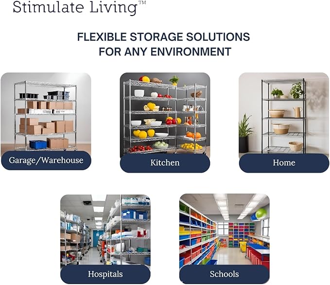 - â FLEXIBLE USAGEâ Our Stimulate Living Wire Shelving is designed to be flexible and adaptable to a wide range of settings. It can be used in warehouses to store heavy equipment, in kitchens to hold cooking utensils, in garages to organize tools, in hospitals and laboratories to store medical supplies, in offices to keep files and documents, in retail stores to display merchandise, in restaurants to store kitchenware, in factories to hold raw materials, and more.