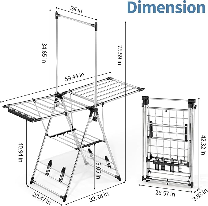 - Foldable for Easy Storage: The rack folds down to a compact size of 26.57" x 3.93" x 42.32", making it easy to store in closets or small spaces while keeping your laundry area organized