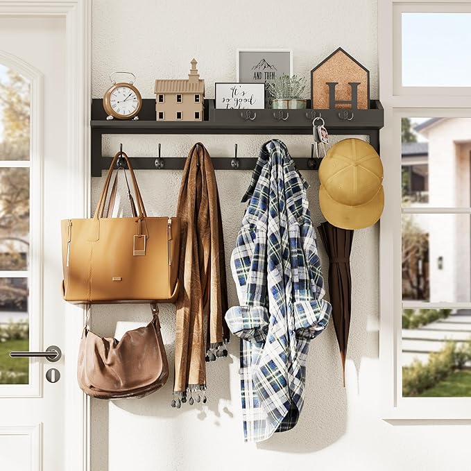 AMBIRD 35 inch Wall Hooks with Shelf, Coat Rack Wall Mount, Large Coat Hanger for Wall, Entryway Shelf with 7 Dual Coat Hooks, 4 Key Hooks and Mail Organizer, Wooden Key Holder Rack (Black)