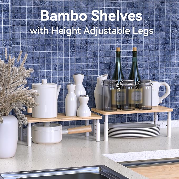 Cabinet Organizer Shelf, Spice Rack Set of 2 Kitchen Pantry Cupboard Shelves, Stackable, Height Adjustable, Natural Bamboo (15.6" W)
