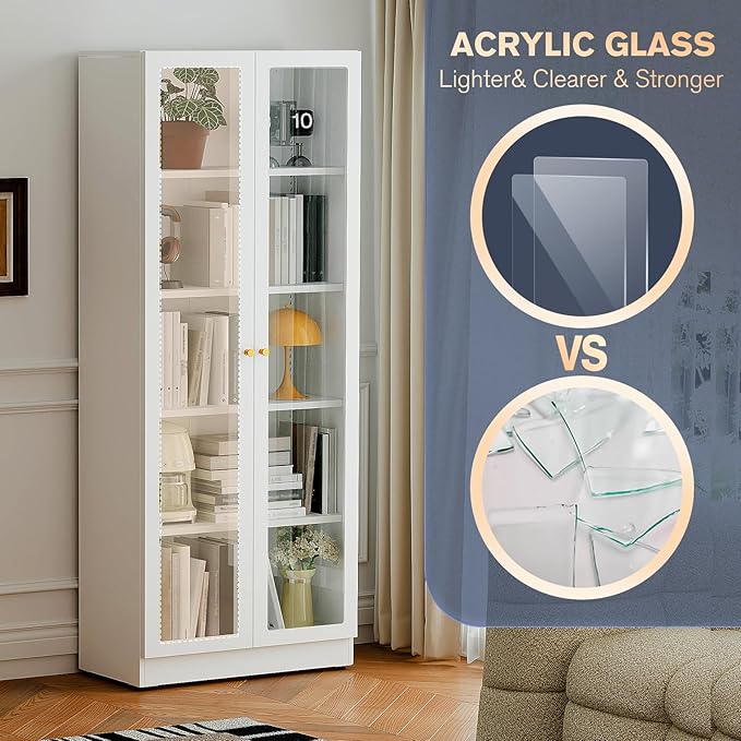 5 Tier Metal Curio Cabinets, Modern Bookshelf Cabinet with 4 Adjustable Shelves, Cabinet Display Case for Home Office, Living Room, Pantry (White-27.5W)