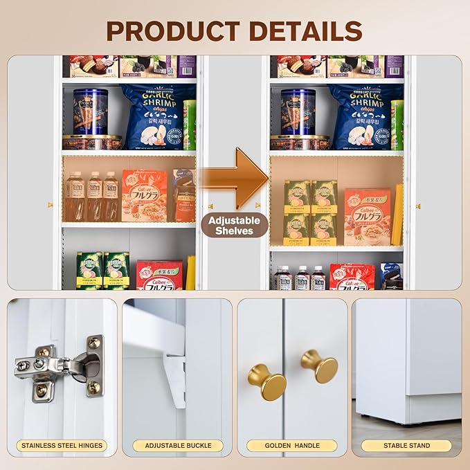 - 4 Adjustable Shelves Design: The garage cabinet storage equipped with 4 adjustable shelves to provide adaptability and convenience. You can adjust the hooks of the shelves according to the size of your items, move the shelves to the desired height, and you can allocate space in your cabinet. You also have the flexibility to design your garage storage cabinets by moving the shelves out for more space. Whatever your storage needs are, you have the ability to create a unique storage space to meet them.