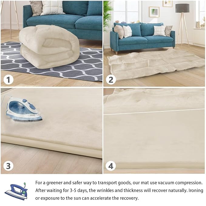 - đHOW TO CARE FOR YOUR MAT:When you open the package,it may be wrinkled,very flat and inelastic.Donât fret - this is normal! As long as it is left for 3-5 days, the mat will naturally regain its thickness and elasticity. we recommend steaming or ironing it to speed up recovery. After you have completed the steaming/ironing, your thick floor padded mat should rebound and be ready to use!