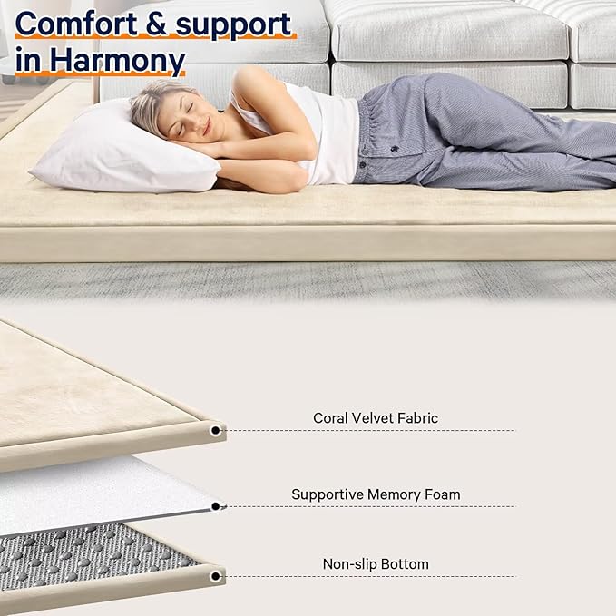 - đŁSAFE & COMFY: Our baby play mat is made of 100% coral velvet material and filled with high-quality 3cm thick memory foam,eco-friendly and durable, providing a safe and comfortable play area for your little ones, without worrying about them hurting themselves on hard floors.The surface of this floor mat is velvet cover, which is not only soft and comfortable to touch, but also has a good cushioning effect.