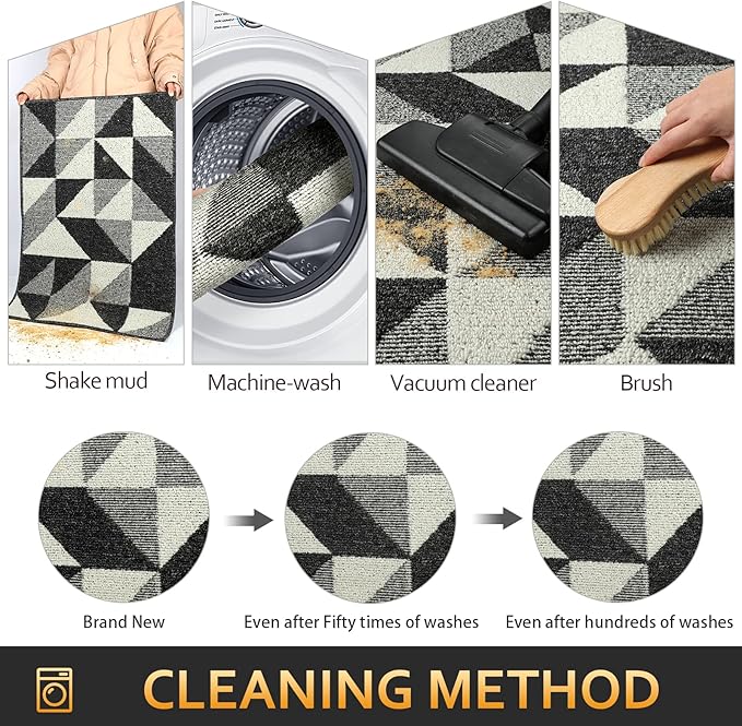 • EASY TO CLEAN: The unique rib fabric design removes dirt from shoes easily. When your doormat gets dirty, first shake it off outdoors or over your garbage bins, then sweep with a broom or vacuum regularly or use a garden hose to rinse the mat outdoors. For deeper clean: machine washable, use water under 86 (℉) / 30 (℃). Do not iron. Do not bleach. Do not expose it to the sun for a long time.