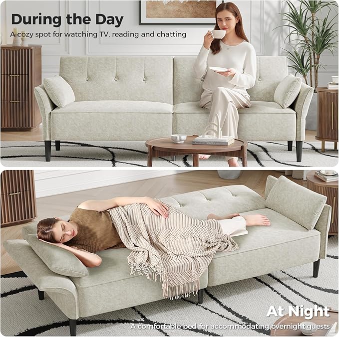 - 【Four-position Adjustable Armrests】Designed in popular styles, this convertible sofa bed is a perfect blend of style and durability. The armrests on both sides can be deployed outward for maximum side lying area, and the maximum deployment angle can be up to 90°. Meanwhile, with the two soft report pillows provided, you can place the pillows at the cervical vertebrae and lumbar region to effectively relieve fatigue