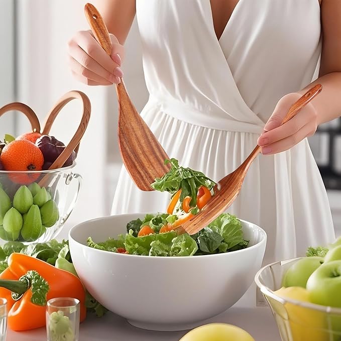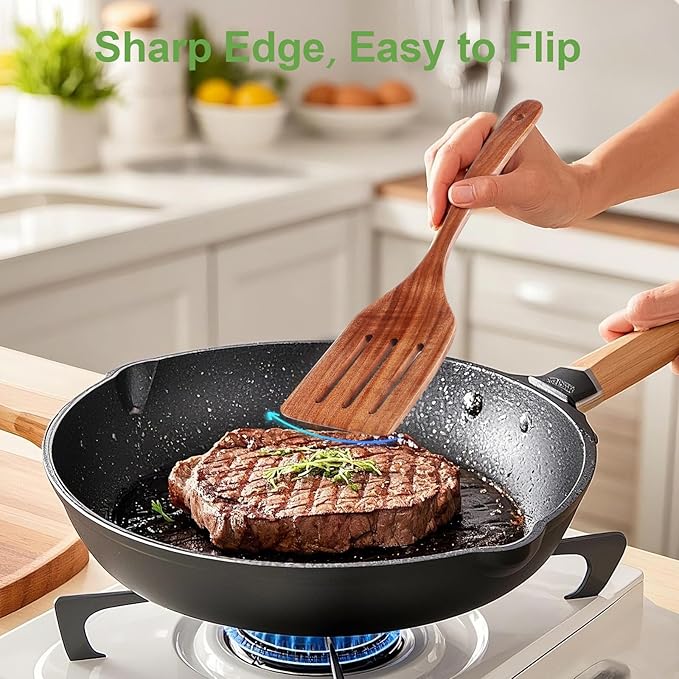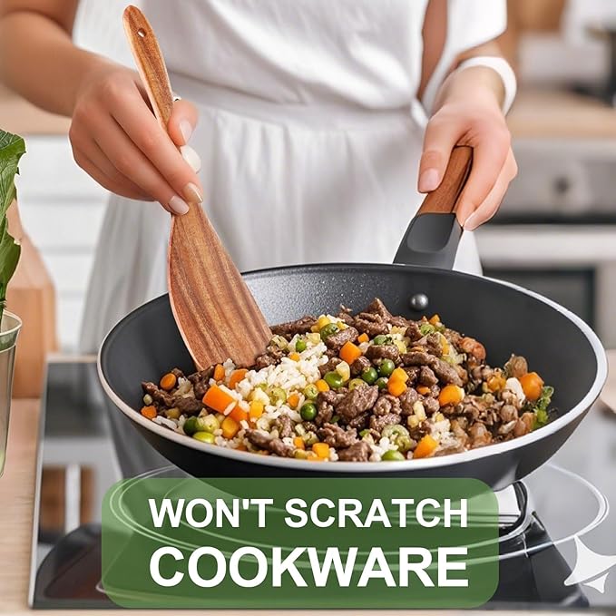 - NON-SCRATCH & HEAT RESISTANT: These wooden spatulas are gentle on the surfaces of your non-stick pans and other cookware, ensuring they do not scratch or damage them. Our wooden cooking spoons do not conduct heat efficiently. This makes them exceptionally safe to handle even at high temperatures, allowing you to stir, flip, and serve with confidence without concerns about burns or heat transfer.