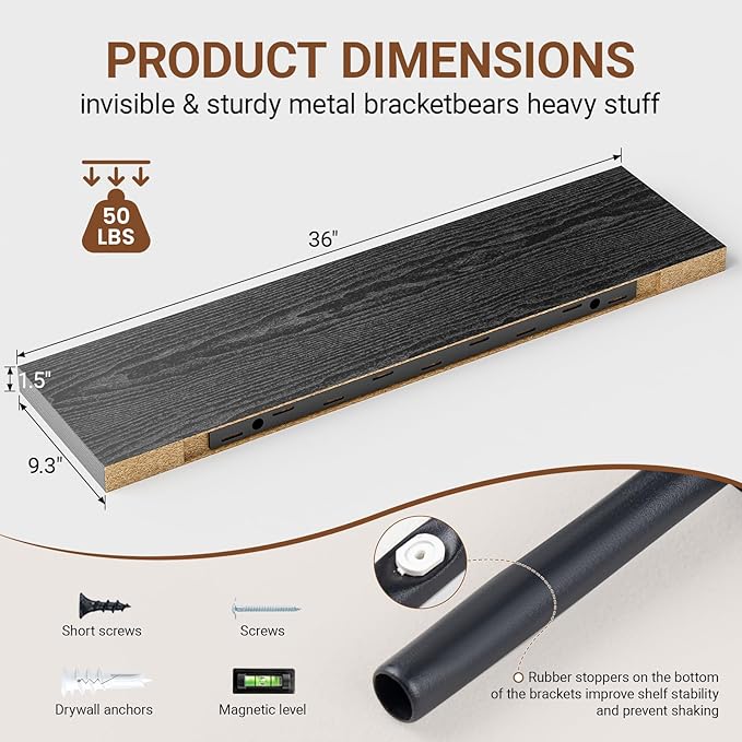 - 【Longer Design】Our pretty 36 inch wall shelves are 36"W x 9.3"D x 1.5"H.Our black shelves for wall is longer than traditional designs and can hold more items.The 36 inch floating shelf optimize wall space,helping organize essentials without taking up floor space in your home.