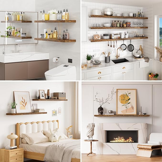 - 【Longer Design】Our pretty wall shelves are 40"W x 9.3"D x 1.5"H.Our brown floating shelves is longer than traditional designs and can hold more items.The rustic brown floating shelves optimize wall space,helping organize essentials without taking up floor space in your home.
