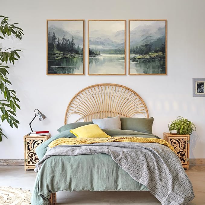 Aurlan Emerald Green Mountain Lake Landscape Framed Wall Art(16"x24"), 3PCS Abstract Forest Nature Canvas Artwork, Large Minimalist Watercolor Modern Pine Trees Scenery Decor for Office Home