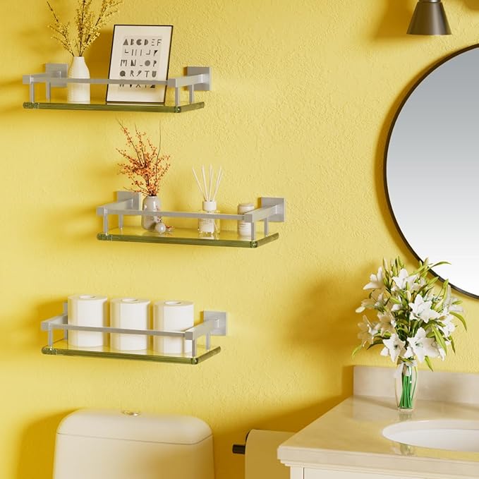 - CLEAR VIEW:The transparent glass of our floating shelves for bathroom allows you to showcase your items while keeping your space looking uncluttered and open