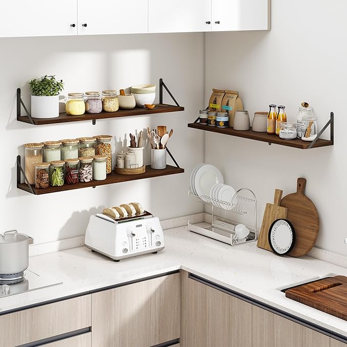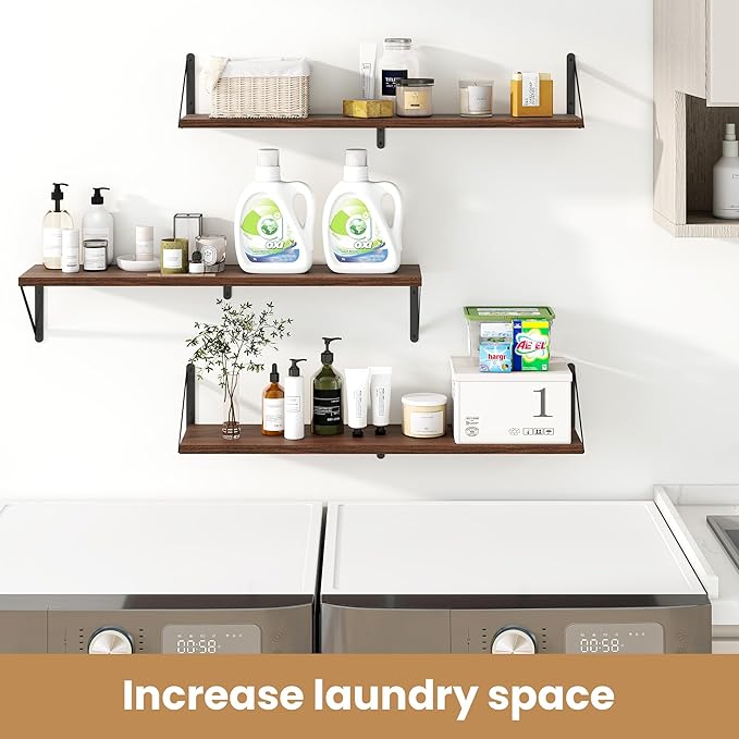 Heimlove 36 Inch Floating Bookshelves Set of 3,Heavy Duty Wall Mounted Bookshelves,Bookshelf for Living Room,Bedroom,Kitchen,Laundry Room Storage & Decor-Walnut Color