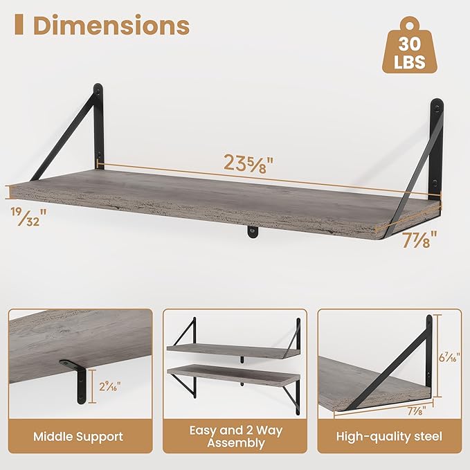 - 【Sturdy and Durable】The wall-mounted shelves are sturdy enough,with a load-bearing metal frame added in the middle,which will not deform and can withstand a weight of 30 pounds. It is very suitable for use as a wide bookshelf,TV stand,for home office,laundry room. Follow the instruction steps,including all necessary hardware,easy to assemble.