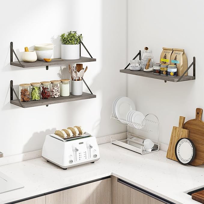 Heimlove Floating Shelves for Wall 24 Inches,8 Inches Deep Wall Bookshelf Mounted Display&Storage Wood Shelves for Kitchen Bathroom Laundry Living Room,Set of 3 (Silver Grey)