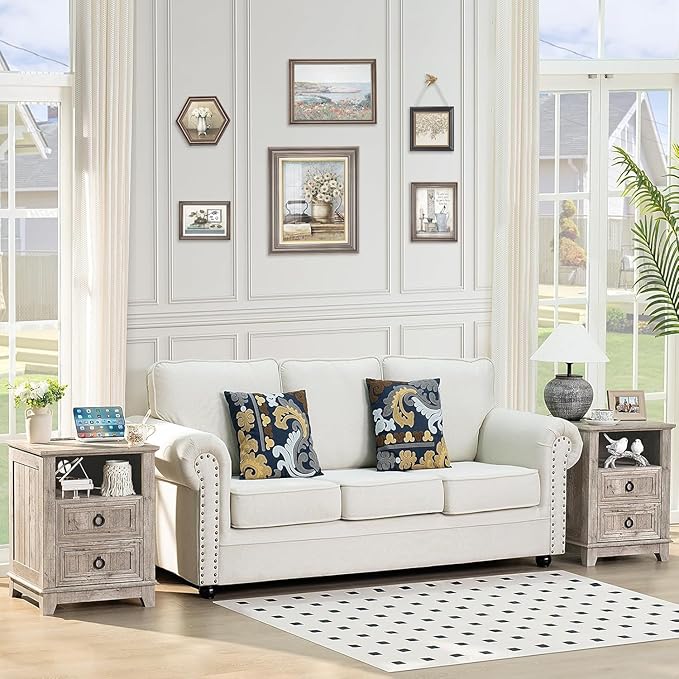 - End Table with charging station : The side table with storage is equipped with 2 standard AC sockets and 2 USB ports. This tall nightstand provides great convenience when you use electronic devices, keeping your charging devices within reach. A 2.3-inch round hole is designed on the back to facilitate the arrangement of socket power cables and charging cables, making the desktop more tidy.
