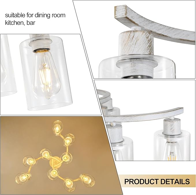 - Modern Style: White farmhouse chandelier has 3 arms that radiate outward from the central arc, presenting a simple but not simple beauty. The body of the antique metal chandelier is made of high quality metal and the surface is finished with a handmade antique white lacquer finish. The clear glass shade not only ensures the soft scattering of light, but also complements the cold and hard texture of the metal, making the whole large glass chandelier both powerful and delicate. The downward-facing glass shade does not easily accumulate dust and is easy to clean.