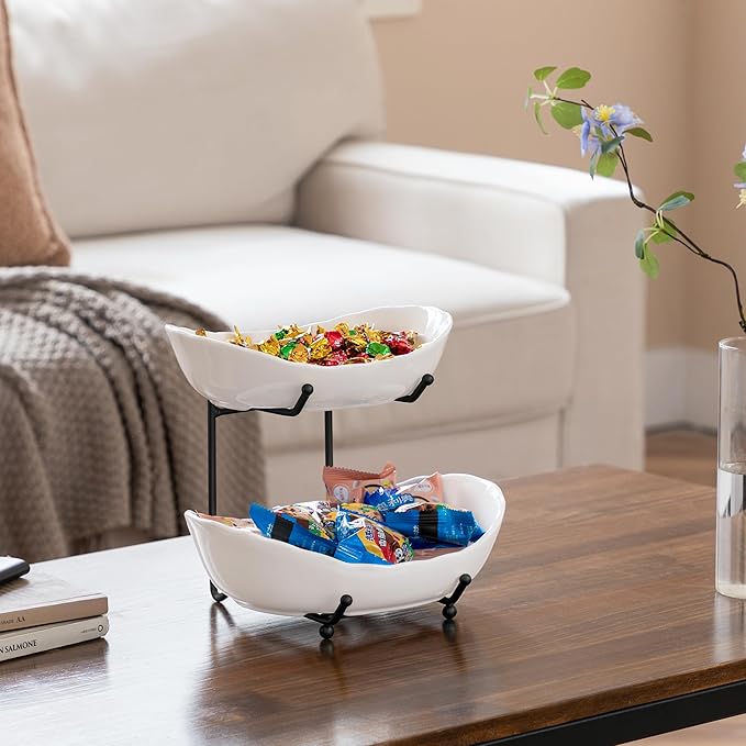 HBlife Fruit Bowl for Kitchen Counter - 2 Tier Ceramic Fruit Rack, Fruit Basket for Fresh Fruit&Veggies, Tiered Fruit Platter Serving Trays for Party
