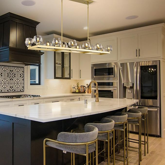 - 【12-Light Chandelier】Gold rectangle chandelier offers 360° light coverage to brighten your space & create a cozy vibe. The linear chandelier for dining room requires 12 G9 bulbs and available for infinite dimming via a dimmer. (Dimmable bulbs & dimmer not included).