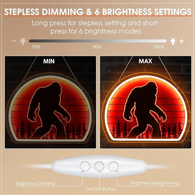 - 6 Levels of Brightness: The big foot neon signs for men adds a dimmer switch, offering 6 levels of brightness to set. Short press "+" and "-" buttons or long press for stepless brightening and dimming to meet various lighting needs. The warm white light color is bright and gives whole room a great ambiance, it also acts as a form of nightlight for kids.