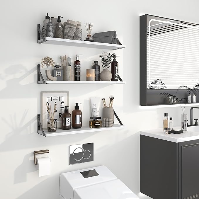 Heimlove Floating Shelves for Wall, 24 Inch Long Wood Floating Shelves Set of 3, Wall Mounted Hanging Shelf for Bathroom Bedroom Kitchen, White