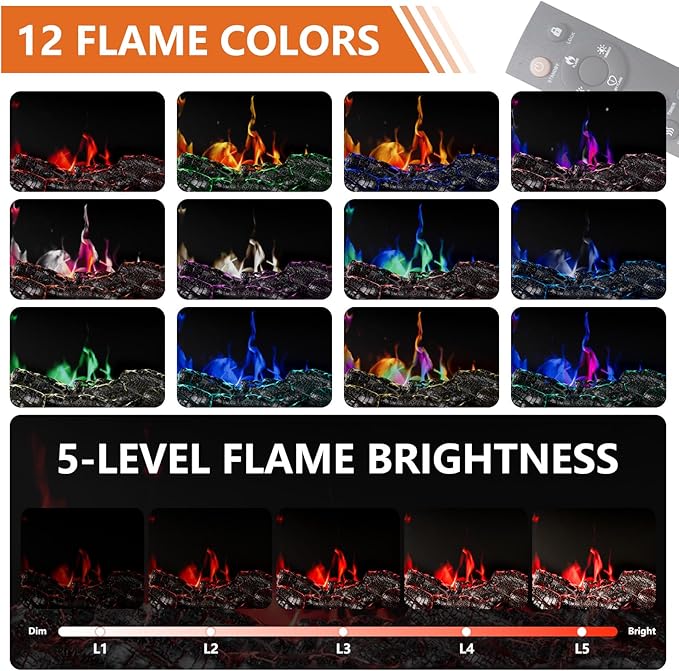 - 3-Side Glass Display Fireplace: The fireplace offers stunning panoramas of the flames from three angles. Featuring 5 settings for flame brightness, 12 colors of backlight and 12 LED colors of light strips.