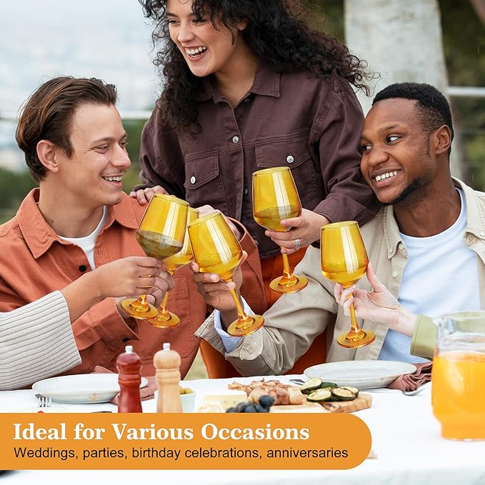 - 【Elegant Amber Wine Glasses 】Glazvia Amber wine glasses set of 6 comes in a variety of stunning shades including 6 amber wine glasses. These wine glasses are perfect for any occasion, whether it's a casual family gathering, a formal dinner, or a fun wine tasting event, the beautiful Amber glassware add a pop of color to your table setting and create an elegant atmosphere.