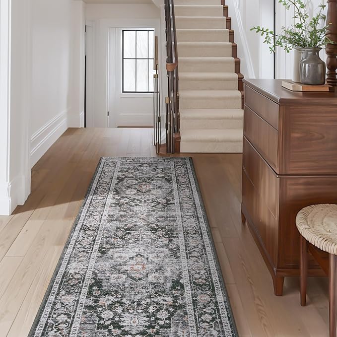 AMOAMI-2X10 Runner Rug-Washable Runners for Hallways-Soft Non Slip Bedside Rugs for Bedroom-Vintage Long Rug for Hallways Entryway Laundry Room Stair Kitchen Bathroom Dark Grey & Black