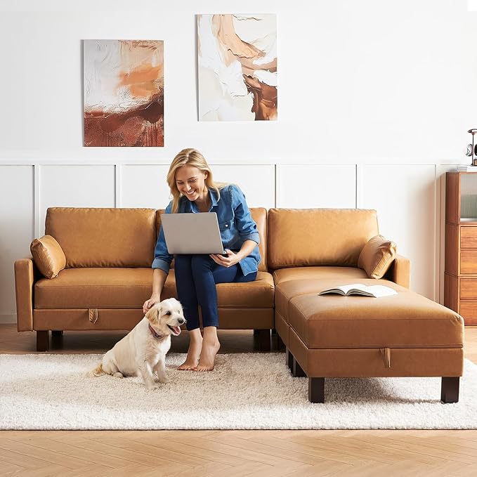 5 Seater Faux Leather Sofa Couch, 98'' L Shape Sectional Couch, Mid Century Modern Decor, Office Sectional Sofa Bed, for House, Apartment, Living Room, Tan