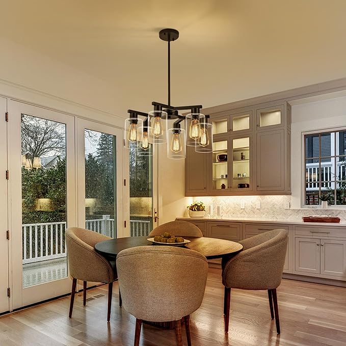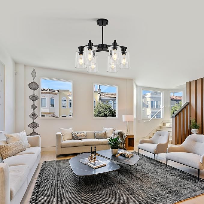 - 【Unique contemporary design】This black chandelier has three elegant “Y” shaped arms that reach out from the center in a distinctive interlocking shape, paired with six cylindrical glass shades to create a striking geometric silhouette. The modern glass chandelier body is crafted from high quality metal with a matte finish for a premium and classy texture. The transparent glass shades are like a light veil, gently wrapping the light and scattering it softly. The shades and the metal body reflect each other, perfectly blending the ruggedness of the industrial style with the sophistication of the glass, highlighting the unique style.
