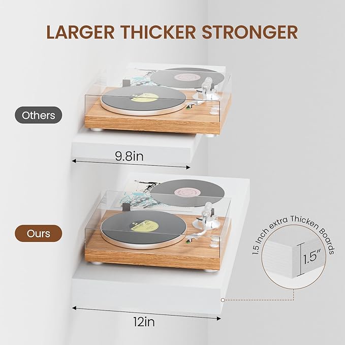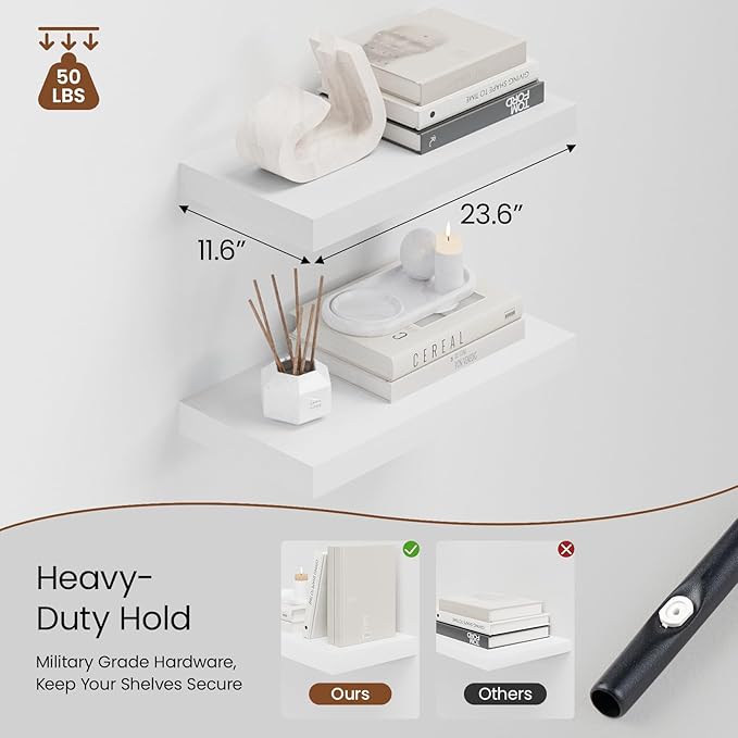 - Extra Deep Floating Shelves: Measuring 11.6” D x 23.6” W x 1.5” H, these shelves are crafted for maximum depth and durability. The spacious 12” depth gives you plenty of room for stylish display, organized storage, and decorative accents. Perfectly suited for your bathroom, kitchen, or living room, they enhance both function and flair in any space!