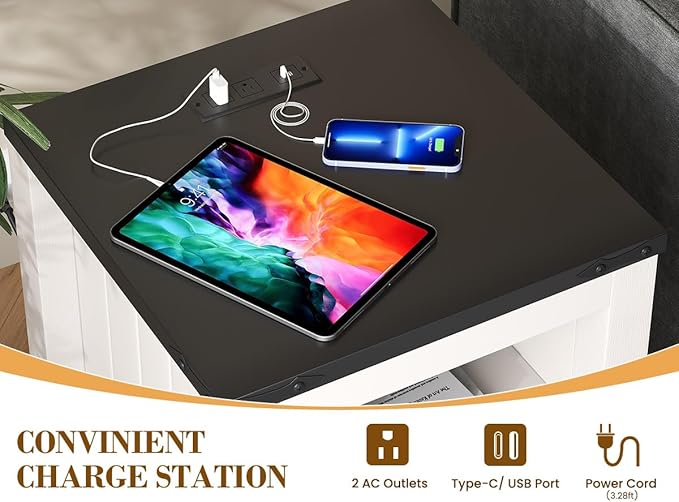 - Built-In Charging Station for Convenience: Stay powered up with the integrated charging hub: 2 AC outlets and 2 USB ports of side tables bedroom let you charge phones, tablets, lamps, and more simultaneously. Keep cables of nightstand with charging station tidy and devices of farmhouse coffee table within reach—no more scrambling for adapters or sacrificing bedside space to clutter