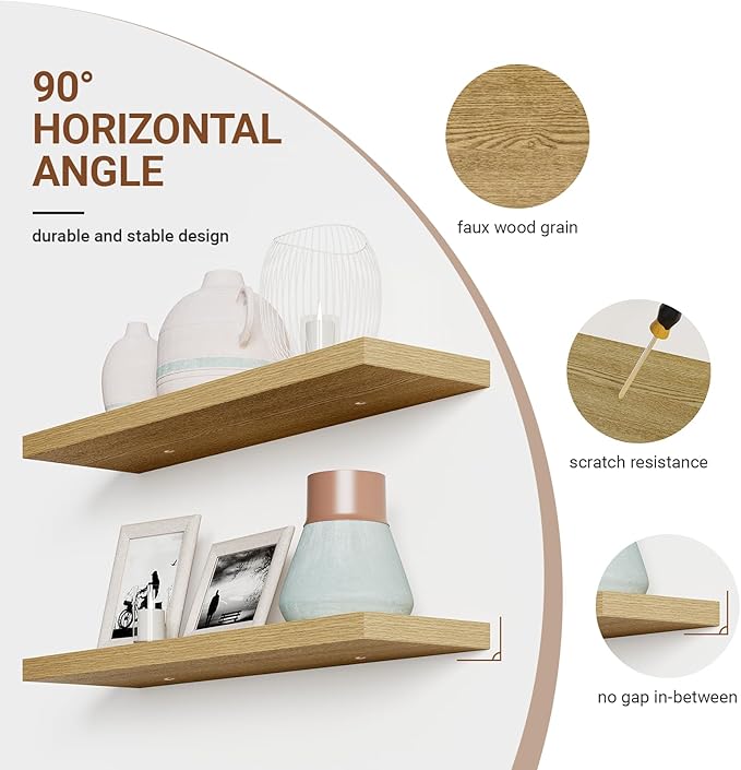 - 【Longer Design】Our pretty wall shelves are 40"W x 9.3"D x 1.5"H.Our white oak floating shelves is longer than traditional designs and can hold more items.The oak floating shelves optimize wall space,helping organize essentials without taking up floor space in your home.