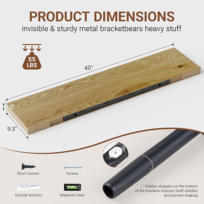 - 【Sturdy & Reliable Material】The floating shelves oak use metal brackets and screws to be firmly fixed to the wall without sagging.Our 40 inch floating shelf are made of high quality MDF material,can hold up to 55 lbs to safely place your items.
