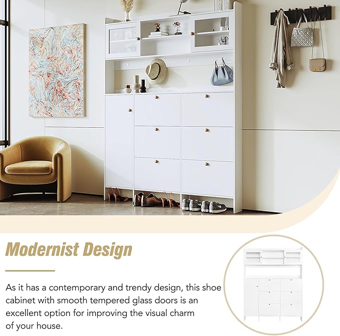 Ball & Cast Tipping Bucket 3-Tier Shoe Cabinet with 6 Flip Drawers and Storage Shelf,Entryway Hall Tree with Tempered Glass Doors and 4 Hooks,for Hallway,Mudroom,Living Room,White