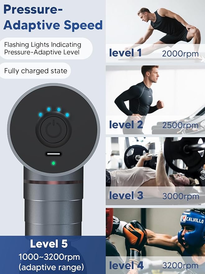 - Pressure-Adaptive Speed Mode: The 5th gear automatically adjusts speed (1000–3200 RPM) based on applied pressure—no manual tuning needed; With five intensity levels, you can personalize your massage for any muscle group with a single button