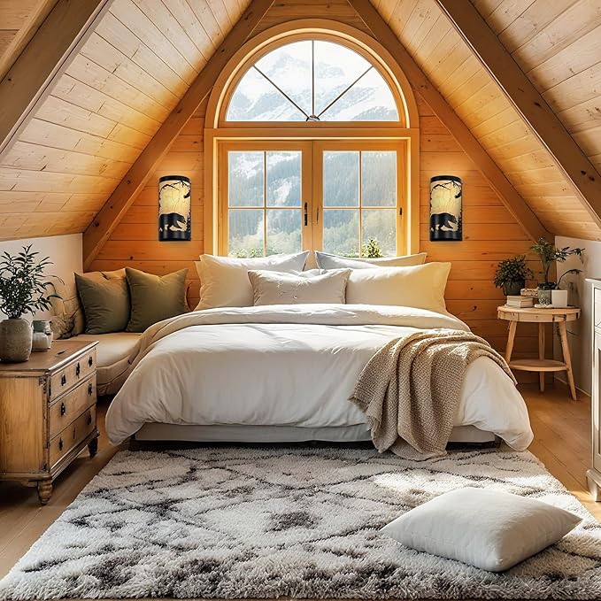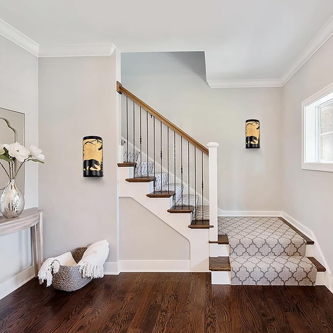 - Rustic Design:The wall sconce light set of 2 are crafted from durable matte black metal,featuring intricate forest elements and a bear silhouette,yellow parchment paper adds a soft,warm glow,enhancing industrial aesthetic of the vintage wall sconce